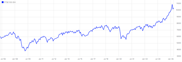 One of the most significant downswings in recent history was in 2020, when the outbreak of the Covid-19 pandemic saw values drop from 7,542 to 5,671 (24.8%) in just three months. However, as shown below, values had recovered to pre-pandemic levels by April 2022 and gained a further 2,386 points by the start of 2026.